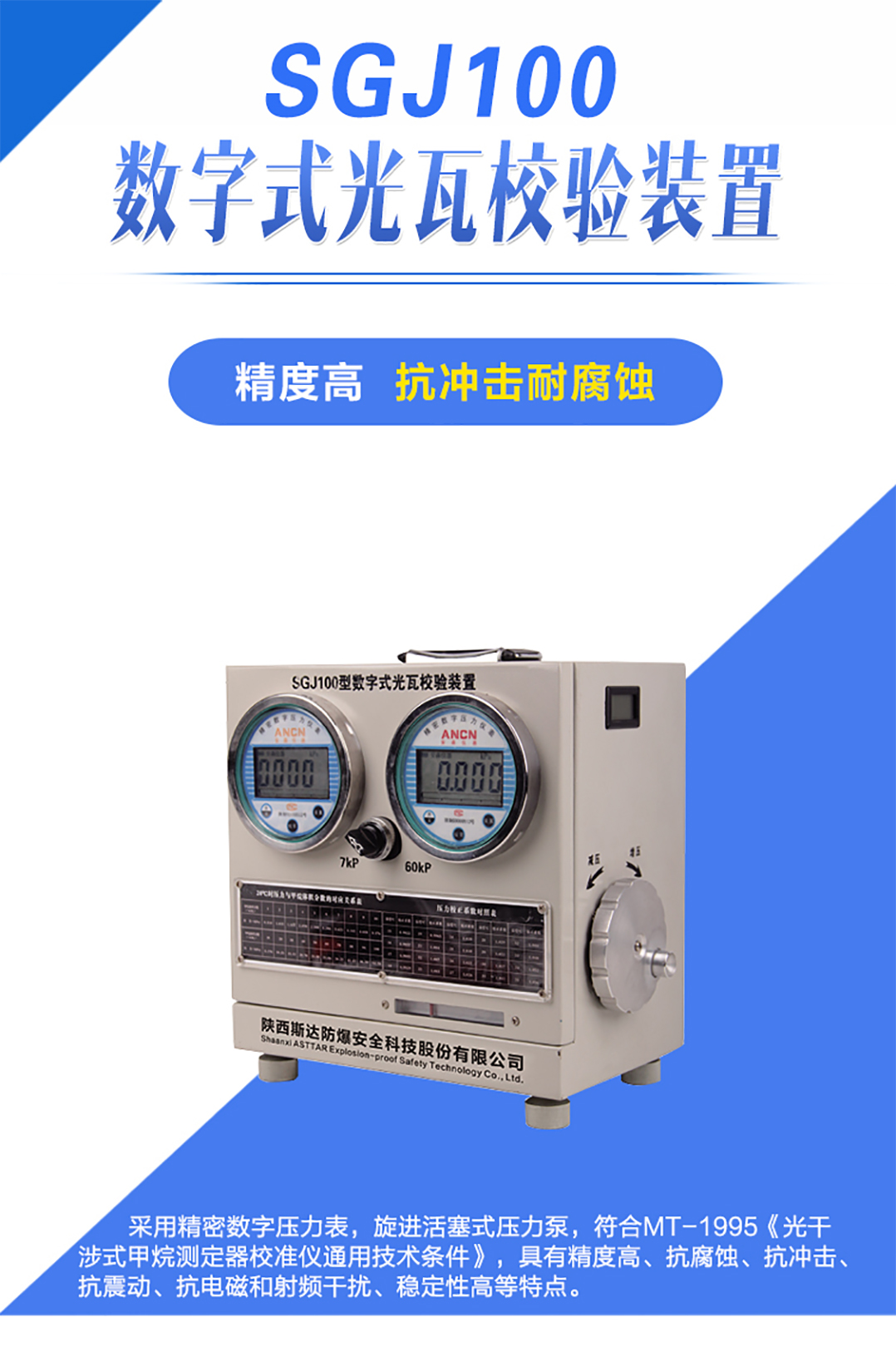 采用精密數(shù)字壓力表,旋進(jìn)活塞式壓力泵,符合MT-1995《光干涉式甲烷測(cè)定器校準(zhǔn)儀通用技術(shù)條件》,具有精度高、抗腐蝕、抗沖擊、抗震動(dòng)、抗電磁和射頻干擾、穩(wěn)定性高等特點(diǎn)。